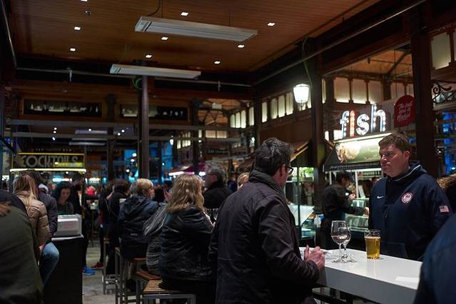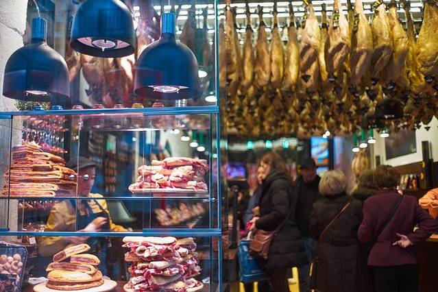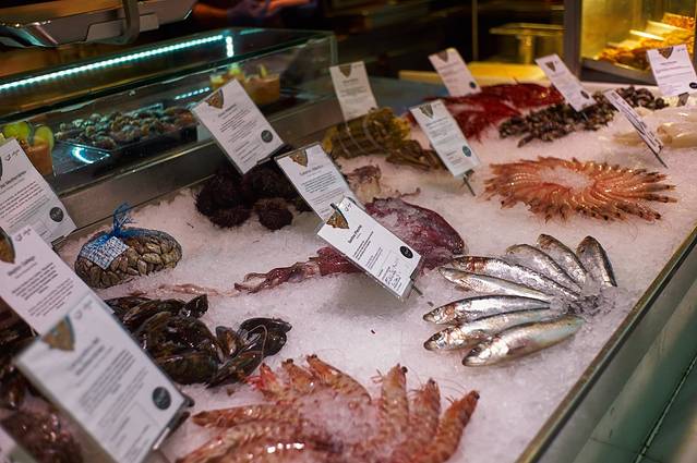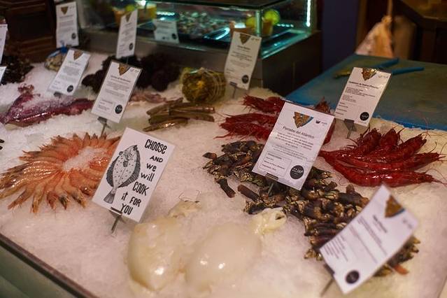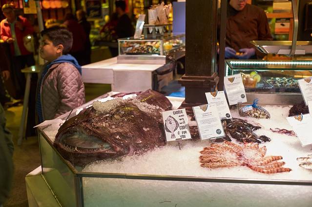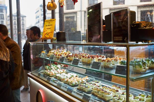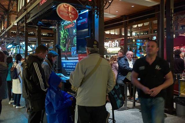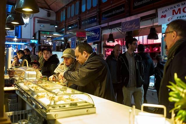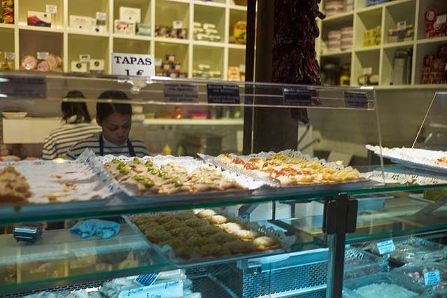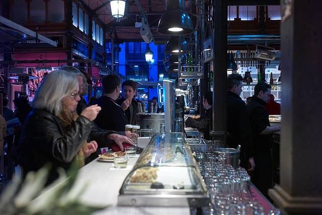 坐出租过去,居然路过了圣米盖尔市场,而且就离那家餐厅很近,本来以为这次没时间来了呢,不得不说缘分呀。于是,在小雨中走回市场。其实,这个市场单纯卖东西的并不多,里面卖的是各种tapas,倒是有点像我们的护国寺小吃,可以买一杯酒在里面边逛边吃,看着就口水流了一地。