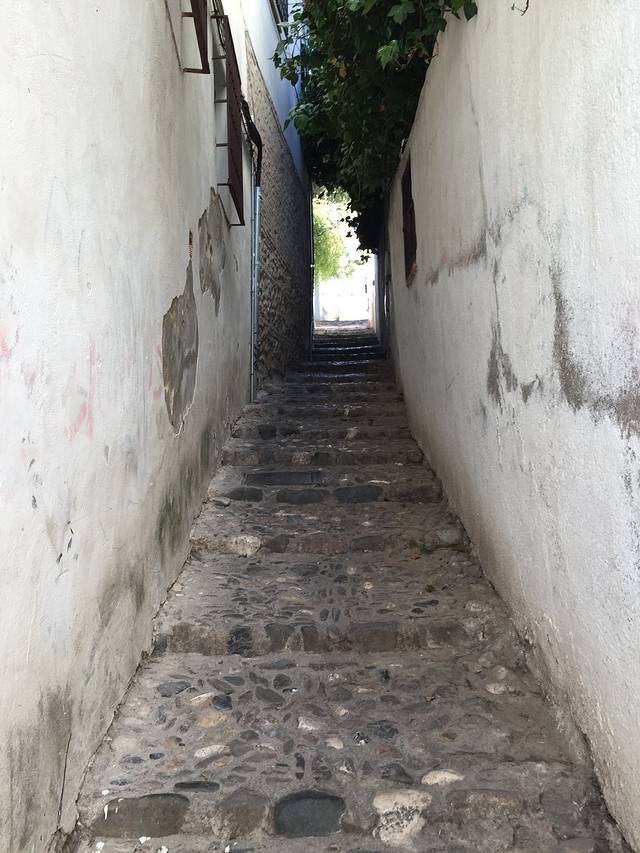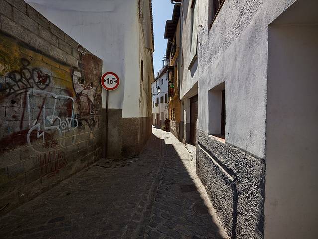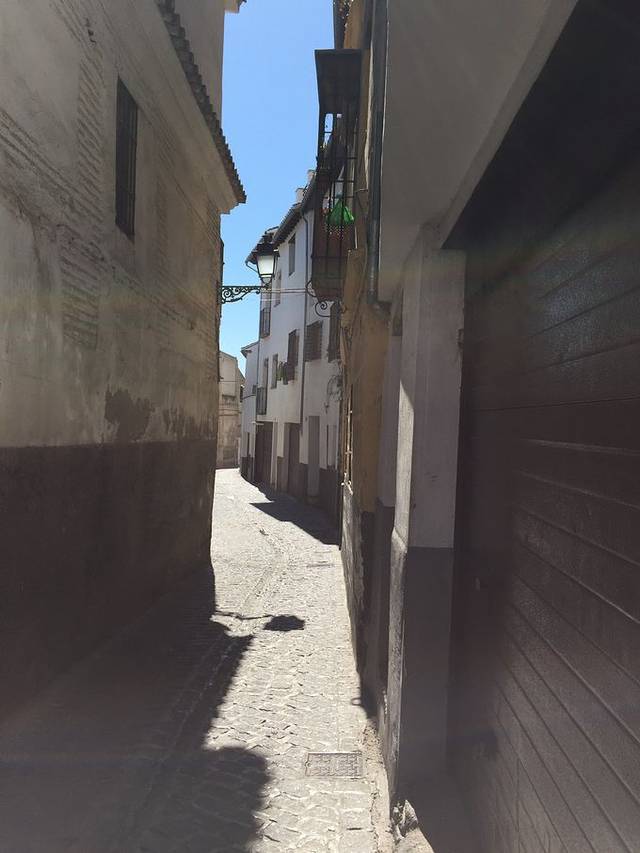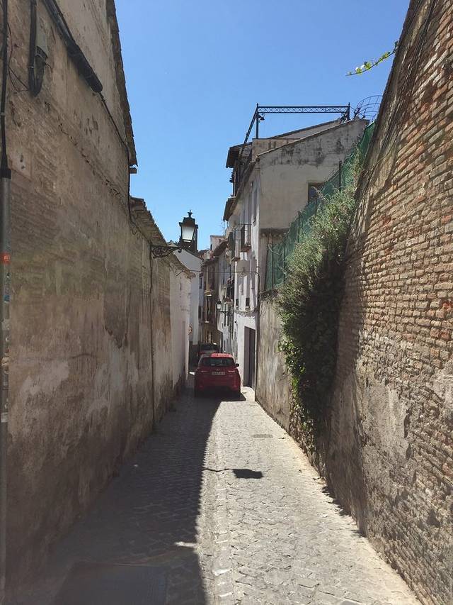 我们按照导航去找酒店,就发现路越来越窄,而且处处单行和禁行,然后,就钻进一个标着1.8M的窄巷子,不由的想起在格拉纳达阿尔拜辛的那条窄巷子,一个还不如我车大的车在那纠结半天,于是,我也腿肚子发软,但是,后面已经有车堵上来了,只得往前走,于是一咬牙一跺脚硬着头皮开了过去,似乎很轻松,一下子就崇拜起自己来了。但是此时,还不知道,更严峻的考验还在后面等着我呢,这还不是我遇见的最窄的路,后来的两天,我遇见了两次比这更窄的路,每次都是带着绝望开了过去的,我是神不是人。虽然从小巷子开了进来,眼看着酒店就在前面,却有遇见禁行过不去了,于是也不打算再绕了,当机立断,找个停车场把车停下了。
