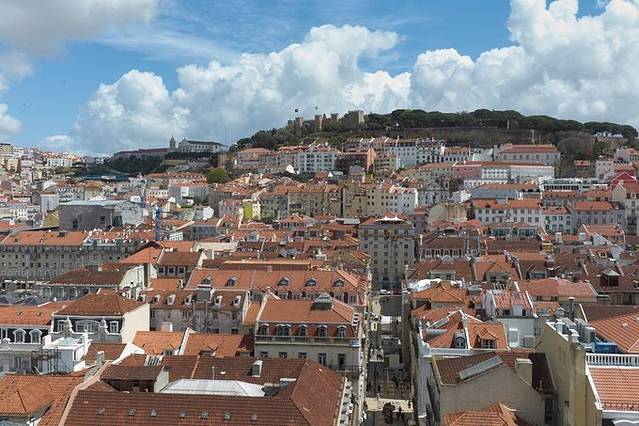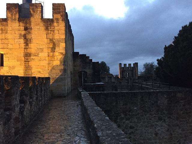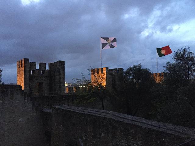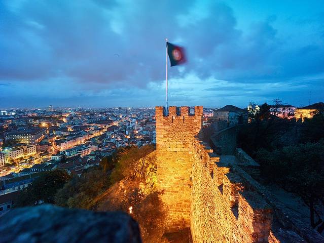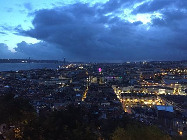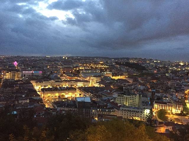雨小了,才重新上了一辆车,在车上遇见了一个在丹麦留学的同胞小伙子。他也正好也要去圣乔治城堡,于是针别姐决定回酒店睡觉,我跟小伙子结伴去圣乔治城堡。圣乔治城堡据说能看见里斯本最美的日落,但是,刚到圣乔治城堡就大雨滂沱,匆匆的跑进城堡去躲雨,城堡里面有些关于历史的小型展览,我看不懂,所以等雨停了就跑到外面看夜景去,此时的城堡只剩下我跟小伙子两个人,我们两个胆子也真够大的,爬到了最上面,虽然没看见美丽的日落,但是还是看见了最美的夜景。