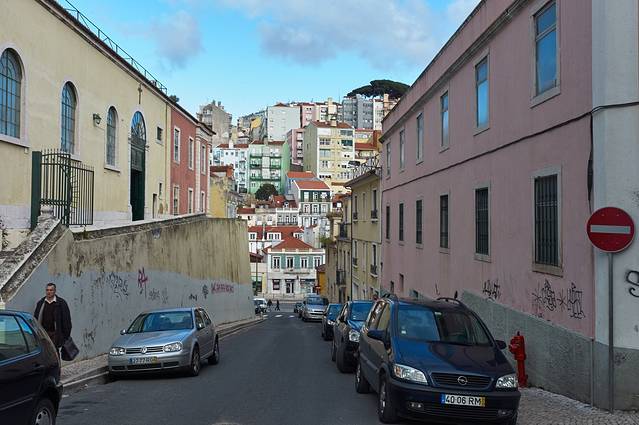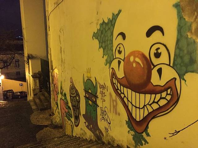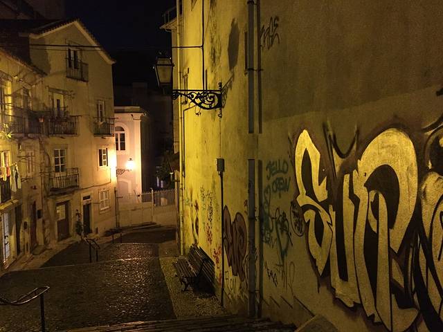 但是,当我拍完照的时候,却发现小伙子已经不在了,我当时真的害怕了,因为外面漆黑一片,城墙像迷宫一样,不知道从哪里下去,而且天不怕地不怕的我,天生却怕夜晚的城墙,和类似城墙的东西,那高耸压抑的的城墙,总让我觉得有一种莫名的恐惧感。于是,急急忙忙地一边绝望地叫着小伙子,一边找楼梯想先下去,终于下到下面,在城墙下面与小伙子又相遇了,他也找不到出去的门了。有了人,心里一下子就踏实,两个人西一下东一下的终于走了出去。在门口跟小伙子分手,他坐地铁回去了,我一看离酒店不远,决定慢慢走回去,难得的这一天,就这么一点悠闲的时间,于是再次领略了里斯本的悠闲。
