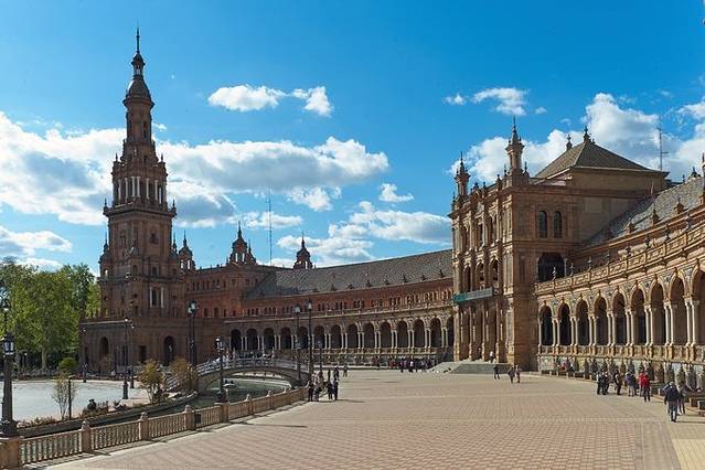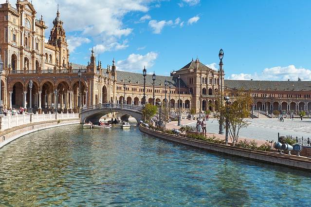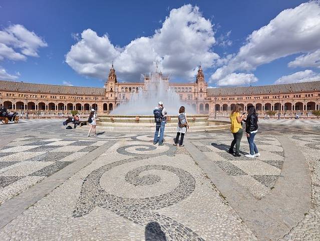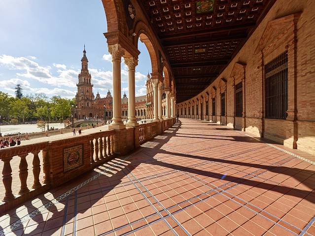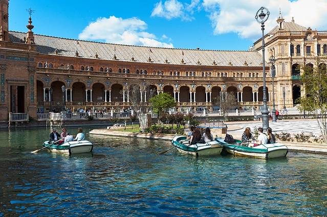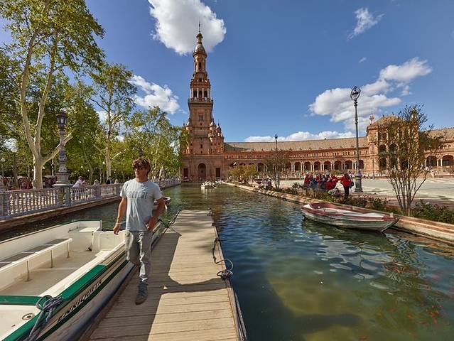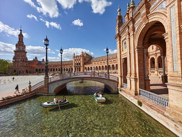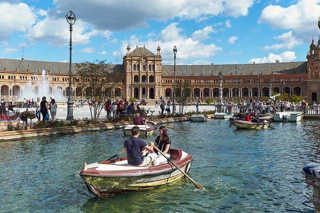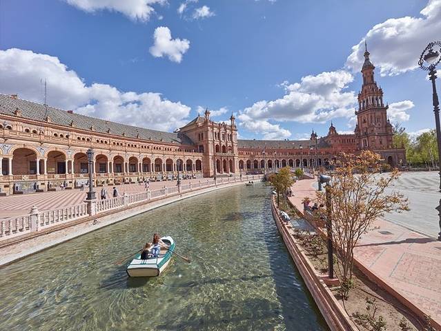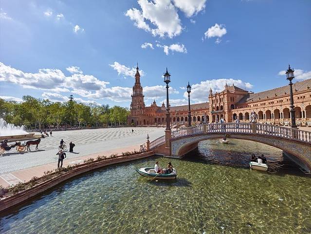 然后,叫了车去了西班牙广场。据说西班牙每个城市都有一个西班牙广场,但是,塞维利亚的西班牙广场无疑是最华丽最漂亮的一个。塞维利亚的西班牙广场是为了世博会建造的,坐落在一个绿荫环绕的公园里,悠闲舒适,是塞维利亚人休闲的地方,可以划船、汽车、野餐,一到这里,我就喜欢上了这里,也后悔来晚了,如果不是6点半的斗牛,我真的想一直在这儿呆到天黑也弄个小船悠闲的在河道里划着。
