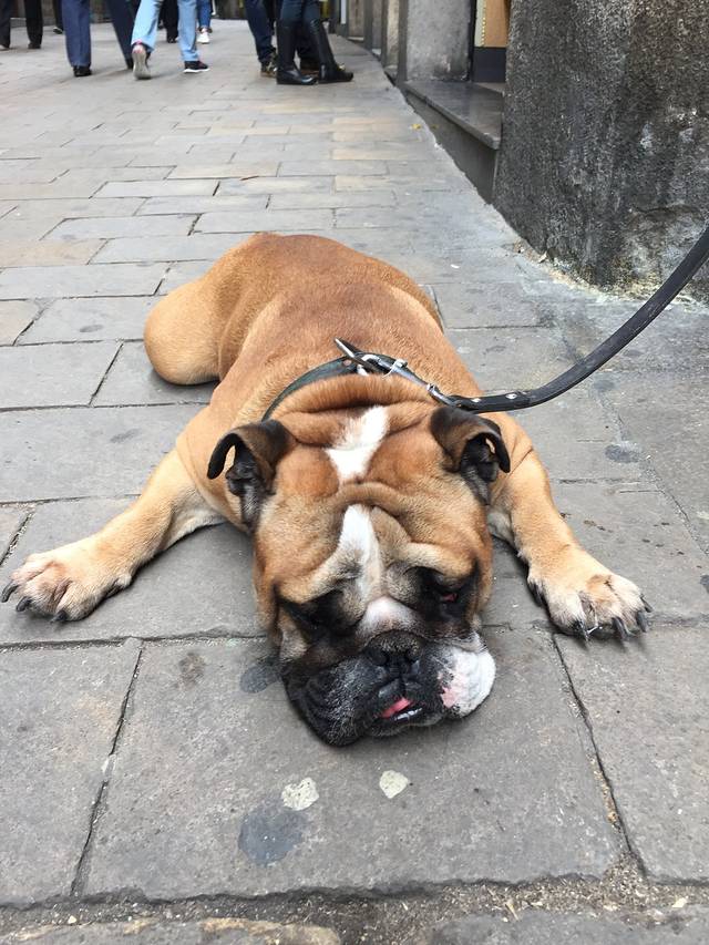 中午去哥特区吃饭,两个逢店必进的大姐进了一家鞋店,这一进,就是两小时。这家鞋店卖的那种木底鞋凉鞋,上面的面可以拆卸自由搭配,而且一双鞋可以配很多面,设计还是不错的,但是,对于一些人来说,有选择实在是一种灾难。两个大姐彻底花眼了。我跟懂事妹就站在门口等,真是等了又等,热闹看了又看,她们就是不出来。我进去看什么情况,当时笑喷。老公主:我觉得这个面有点大,我脚瘦,不太合适。而此时的店主已经有点不耐烦了,店主:如果你确定要,我可以帮你改。老公主,我怎么知道你改完了合适不合适呢?你得改完了,我觉得合适了才能要。我当时晕倒,那个当翻译的接待也晕了,跟我对了下眼神,没有翻译这句话,估计要是翻译了,店主能把她们撵出来。我就特别坏地对翻译笑了一下,那意思你自己受折磨吧,我不奉陪了,就又出来跟懂事妹继续当站街妹。于是看见了下面这只特别赖的狗狗。