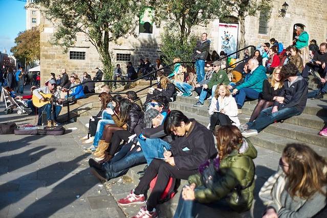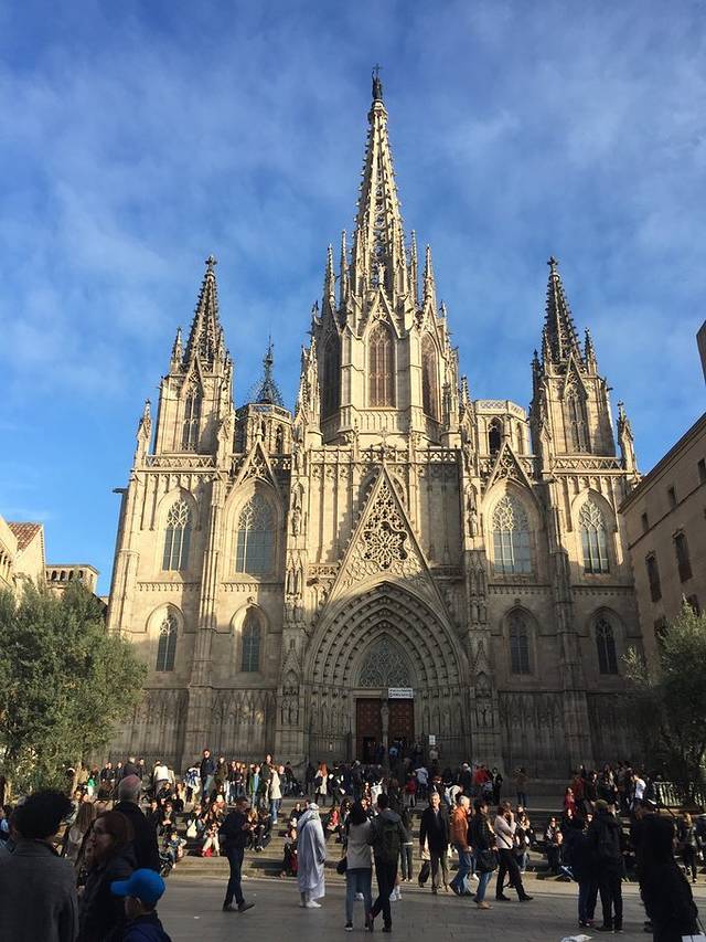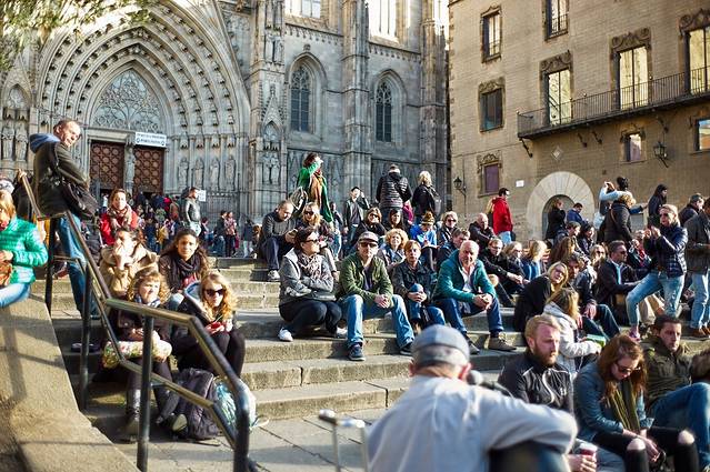 其实这里离巴塞罗那主座教堂很近,又是假期,所以周围很热闹,有闲逛的、有喝咖啡的、有看风景的、有唱歌的、有跳舞的,有谈恋爱的,有看书的、更有发呆的、有遛狗的、还有遛小孩的……这就是我为什么喜欢大都市的原因,丰富、包容、文化、娱乐、自得其乐。