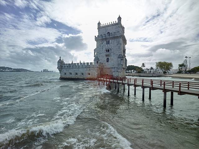 从贝伦蛋挞店出来,又去了贝伦塔,用googlemap一查,有点远,2公里多,针别姐一定走不动,所以,抠逼的我一咬牙一跺脚,决定打车去,但是,就是这样,到了那里还是正好赶上人家关门了,只得在外面转转,贝伦塔在特茹河畔,其实在过去就是一防御工程,现在因为是世界遗产了,所以著名。让我印象深刻的是,特茹河的浪之大,拍在河岸上,直接把相机镜头弄湿了,这应该是我见到过的最大的河浪了。