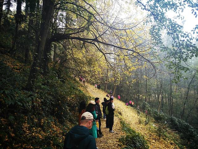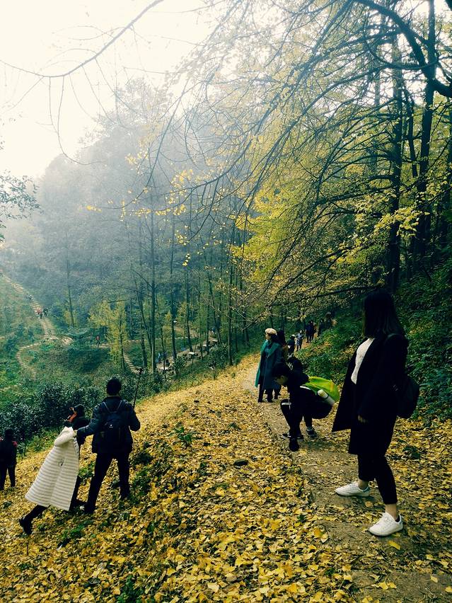 从景区大门拾阶而上,不久后分路向右而行,沿着石板路一直向前,不久便来到了一处周围缀满大片金色银杏的道观。队员们纷纷拿出手机记录下这一美景,拍完美照,我们沿着步道继续前行,不久便开始走山路,沿着土路我们爬上一座小山,在穿过一片树林后,我们来到了一处比较开阔的台地。
