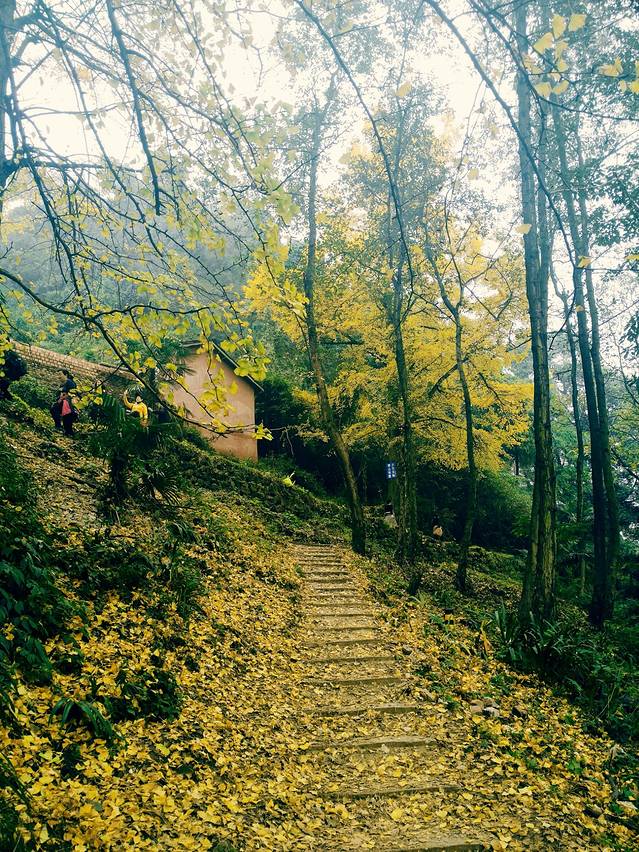之后的路程虽没有之前那般怡人的景色,但深秋的山景依旧令人目醉神迷,铺满落叶的山路踩上去发出一阵令人快慰的声响,对于我们这些走惯了城市里冰冷僵硬的人行道的人而言,的确是别样的体验。
