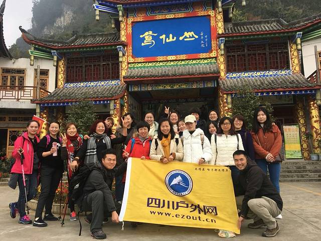 早上天微微发亮,我来到羊犀立交地铁口,撑开四川户外网的大旗,等着队员们前来集合,有两位队员在集合时间前就到了这里,我让他们先弄点东西吃,领队和队员们都陆续到了,今天的队员全都是女性,甚至还有一位来自台湾的朋友,八点中我们准时出发,在车上大家开始做自我介绍然后玩儿游戏,队员们相互之间熟络了起来,在游戏的欢笑声中我们在十点钟左右到达了葛仙山镇,鉴于今天徒步的路程有十三公里,我们将徒步的起点定在葛仙山风景区门口。下车拍完合照后,我们开始了今天的徒步穿越之旅。