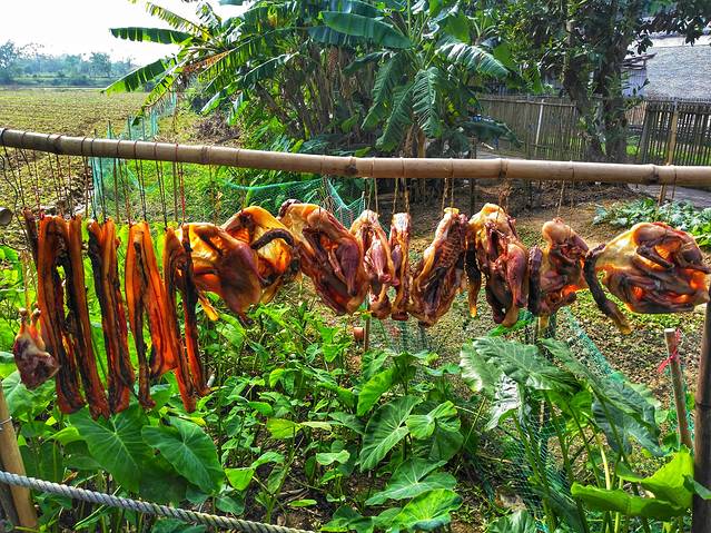 村民好热情,迎面一排腊肉腊鸭,看得口水直流。