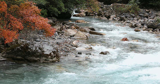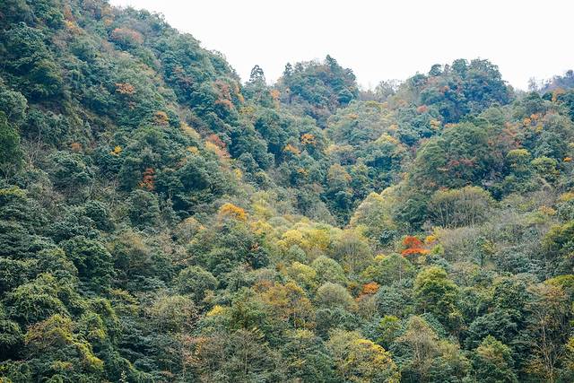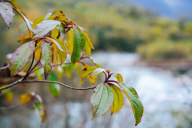 在青衣源下车后有两条岔道,左边是东拉山沟、赶羊沟,右边是桂蔷湾、猫子湾。我们往赶羊沟走,有一处平台风景特别美,冰蓝的溪水清澈见底,水流湍急,在一旁的橙黄色的树叶点缀下格外美丽。听说赶羊沟因保护大熊猫,驱逐外国偷猎者而得名“赶洋沟”,辗转改名为如今的赶羊沟。穿梭在林间,可以看见山顶雨雾缭绕,瞬息万变像一幅水墨画一般,宁静致远。一路上河水水势很大,叶子在风中摇曳生姿,色彩斑斓,让人目不暇接。肆无忌惮的徒步行走大约1个小时,这里的景致虽然很美,但是并没有特别之处。来到“游客止步”的告示牌处,好奇的小伙伴观望了一番,还是选择继续前行,走到一处河滩,湛蓝的河水,感觉像是来到了海边,玩性大发的小伙伴还捡起了石头玩起了打水漂。