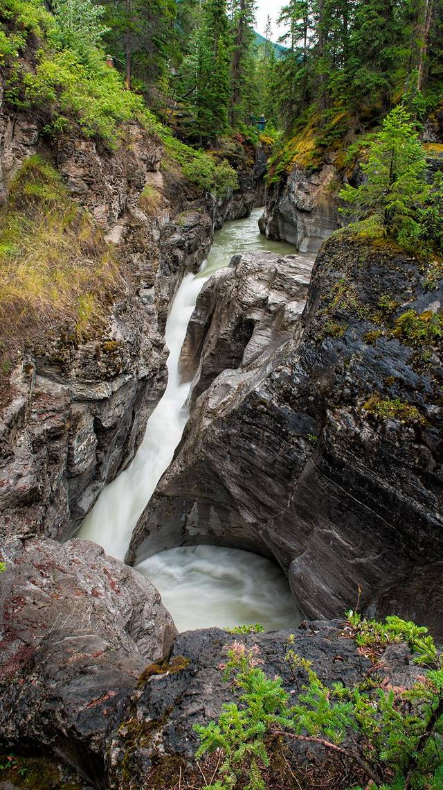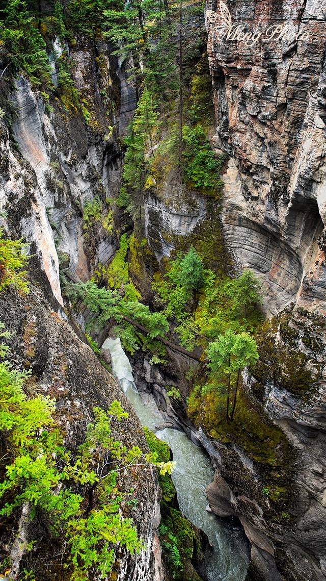 今天出行的重头戏是玛琳峡谷和玛琳湖。但是因为山火的缘故,通往玛琳湖的路被封底了一半,还好通往玛琳峡谷的部份还是开放的。玛琳峡谷是落基山脉中最长、最深的峡谷。这里原先是一个瀑布,但经过一万多年湍急的河水冲激侵蚀石灰石岩床后,行成长2公里,垂直陡峭的岩壁深达5.5公里的峡谷。