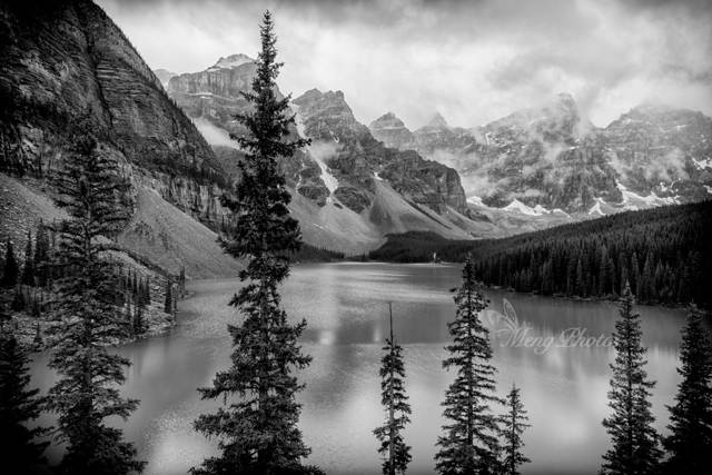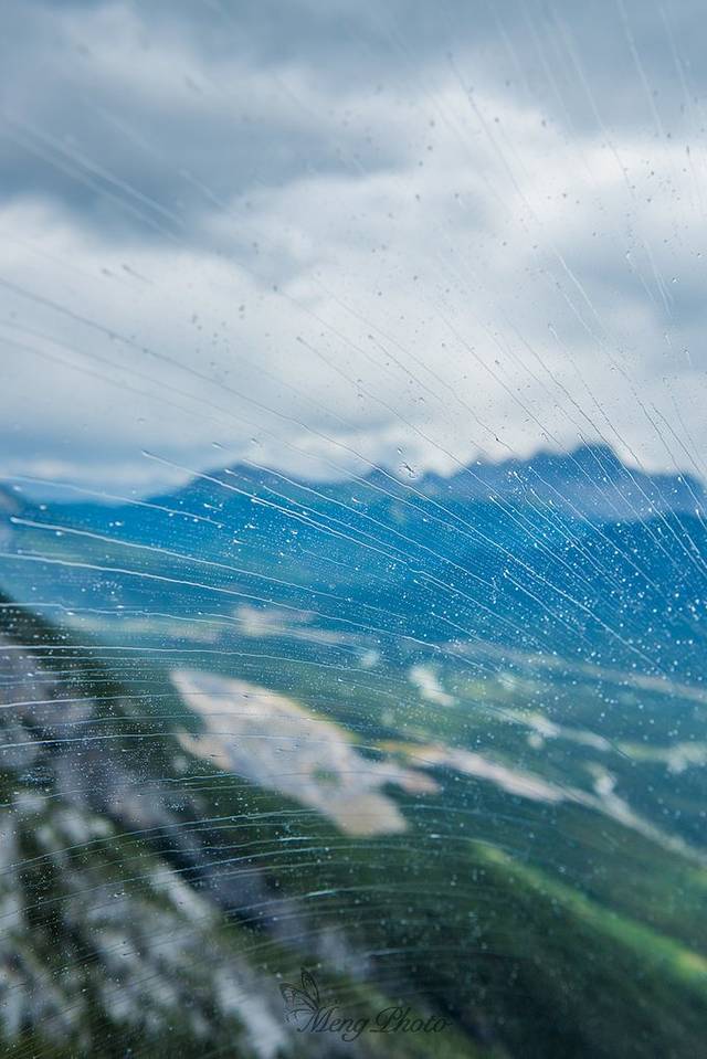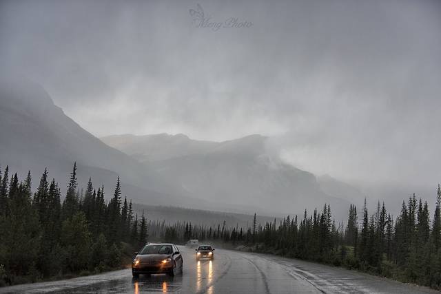 因为前方的道路还长着呢,只能走马观花似的到此一游。刚开了没多久,正一边赶路一边欣赏路边的风景我被这班芙的天气给惊到了。招呼都不打一声地就开始下大雨,满天的阴云把白天变成了黑夜。雨雾严重影响了可见度。路上的车不约而同地降低了速度。