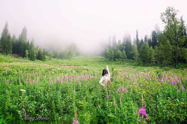 漫漫的,除了远方的山头还被迷雾笼罩,整体的可见度越来越高了。路过一片粉红色的花田,忍不住冲起去合个影。