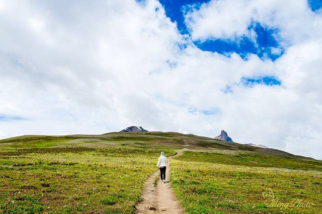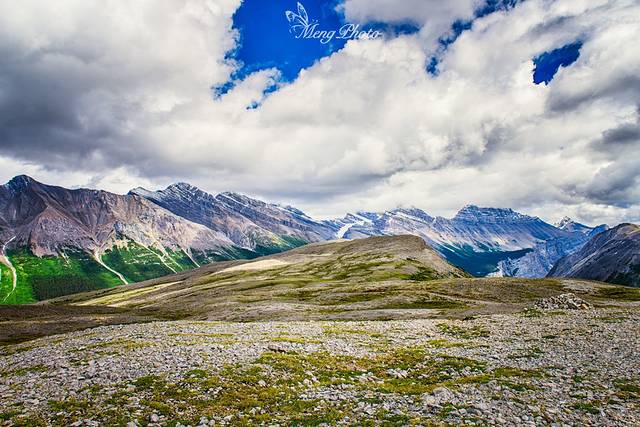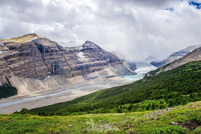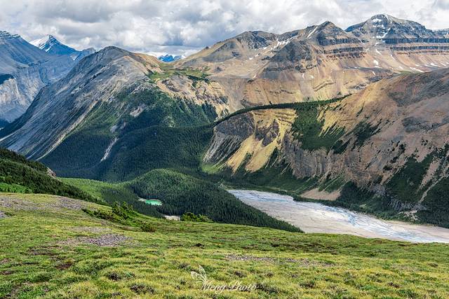 这远处壮观的蓝色冰川是萨斯卡通冰川,是哥伦比亚冰原延伸出来的六大冰川中最长的一条(13公里),一路融化的冰川水会汇聚到北萨斯卡通河。沿着冰川河流的方向看去,发现了躲在山坳里的一个迷你湖珀,像是一滴绿眼泪一样,一转身就被别的山给挡住了。