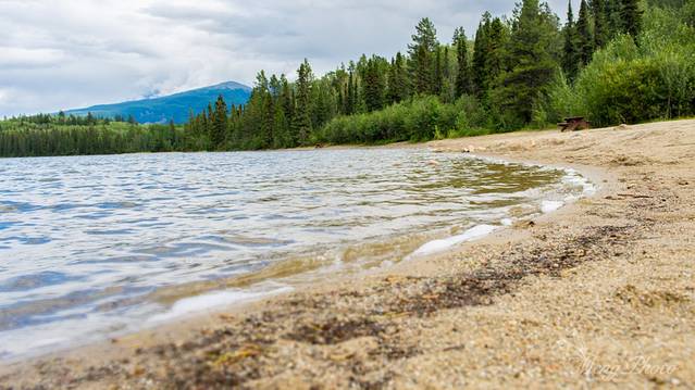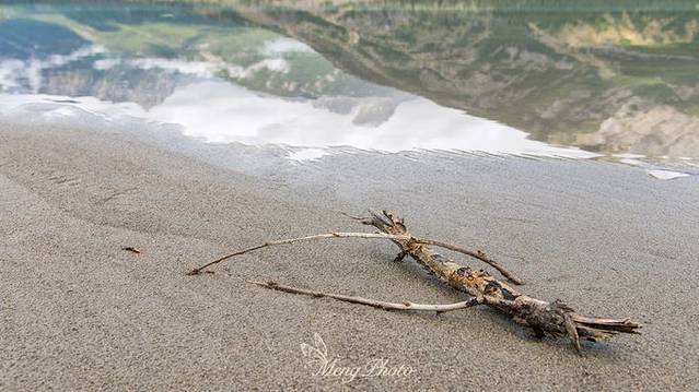 赶紧停车跑下去一看,这座湖岸根本就是一片沙滩。若不是看到那山的倒影,仿佛以 为是在海边。
