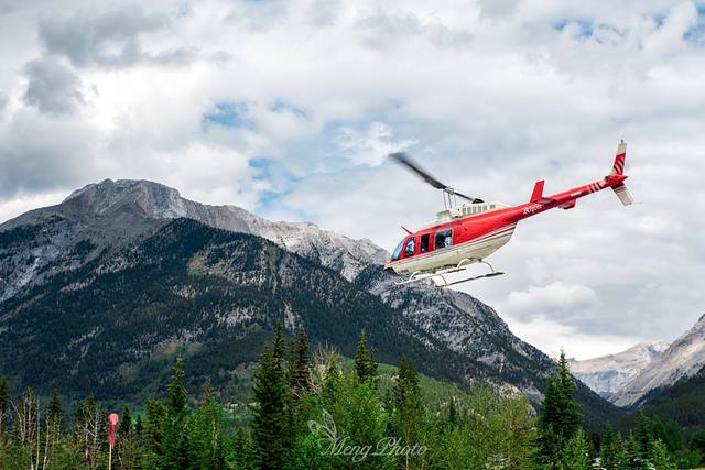 下午三点不到,还在班芙镇闲逛的我突然接到电话,原来是原先预订的直升飞机公司打来的。因为天气原因,本来4点半的直升飞机游览现在要提前到3点半。于是我拔腿就开到直升飞机游览公司所在的,离班芙只有半小时的坎莫尔(Canmore)小镇,赶上了意外提前的直升飞机游览团。