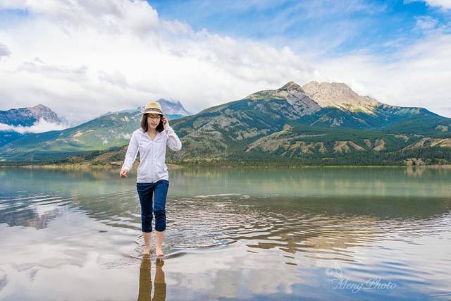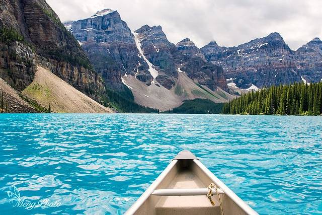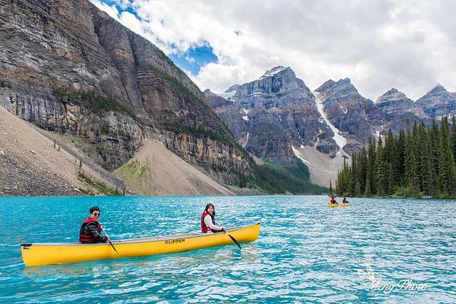 湖岸小径的尽头是一片溪流滩,潺潺的溪水从高山上流入梦莲湖。回到小径入口,我决定租一小时的独木舟试试。之前在路易斯湖和绿宝石湖都看到有不少人惬意地泛舟湖上,可羡慕死我了。虽然没有什么划船经验,但没吃过猪肉也看过猪跑不是嘛。这桨拿在手上,扒啦扒啦地怎么也能把这船划起来。照片可以请租船亭里的工作人员帮你照,让他们多照几张,后期裁剪一下,总能挑出一张好的。