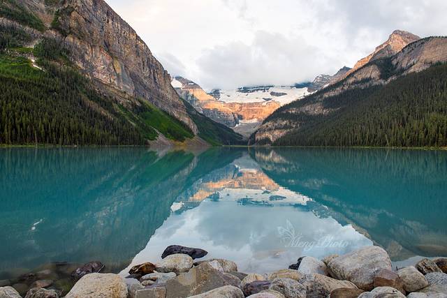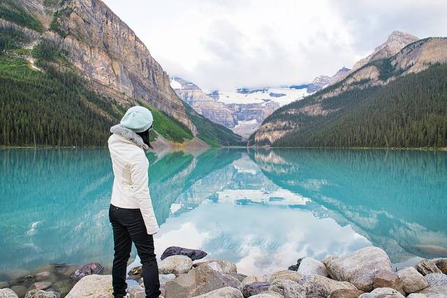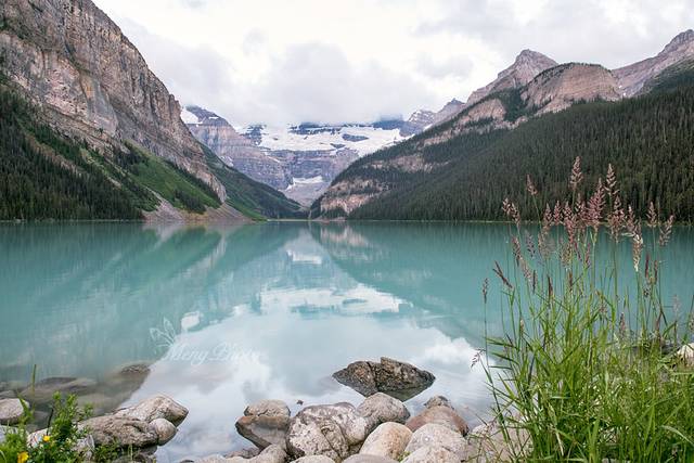 可能因为云层比较厚,虽然天色渐渐变亮,但过了日出的点,也没有看见任何金光。不少人失望地离开了湖边。但是我觉得好不容易早起,湖面又相对平静,就趁着这个机会多了拍几张照片。谁知道15分钟后,大自然立马奖励了我的耐心,把一束金光打在了路易斯湖后面的雪山上。对比那些刚走开正好错过的人,我超开心