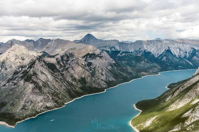 经过班芙小镇,直升机接着向明尼旺卡大河前进。因为西边建造的大坝,长达21公里的明尼旺卡大河是整个落基山脉最长的一条河。明尼旺卡来自于当地原住民语言,意思是灵魂之水。仔细看还可以看到下图左下角有艘游艇在河上穿行。