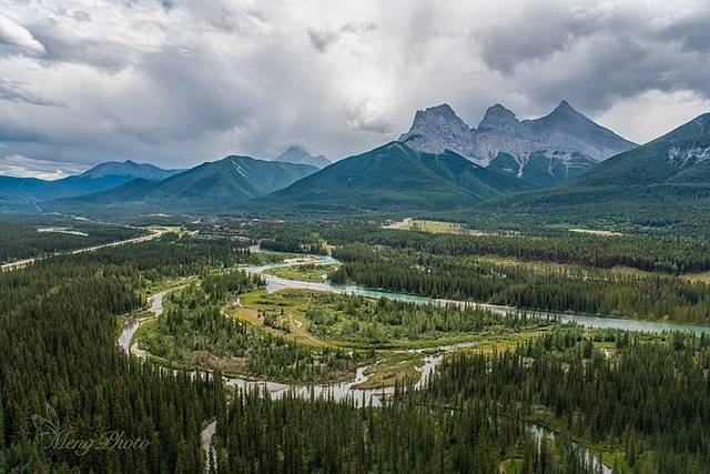 绕着三姐妹峰转了一圈以后,直升飞机朝着班芙镇前进。横穿班芙小镇的弓河蜿蜒曲折,尽头被云雨挡住。在高空看到区部下雨的景象和陆地上完全不一样,十分奇特。