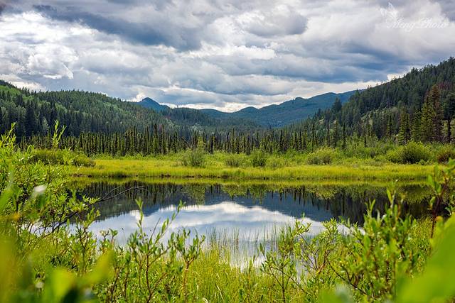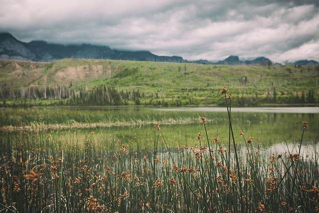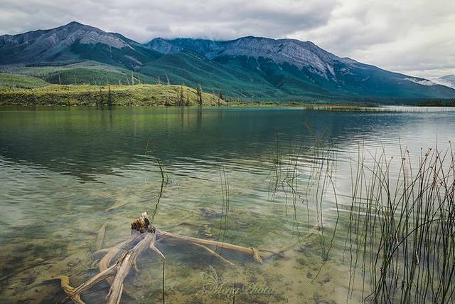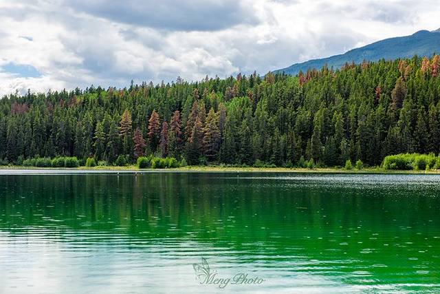 开过湿地,在离金字塔湖3分钟不到的路边是较不出名的Patricia湖。虽然名气不大,但美得不可方物。刚坐下没多久,一阵淅沥的雨水不知从哪儿飘来,打在光滑的湖面上。阴雨让湖水显得更加绿油油。