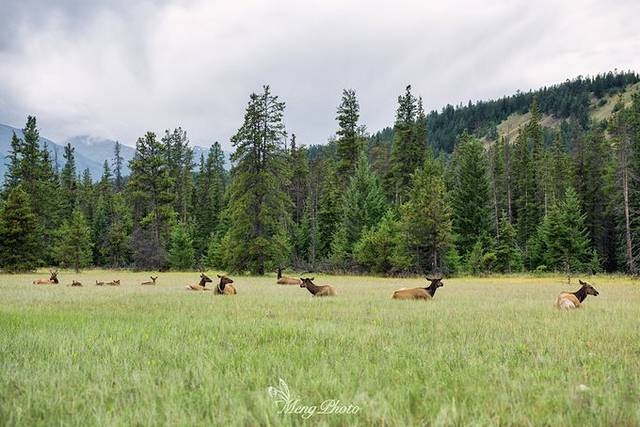 完全不记得晚饭是在哪里吃的了,大概因为不是特别好吃吧。反正这一天的惊喜是在晚饭后往宾馆开的路上。先是看到一片麋鹿悠闲地卧在草丛中,颇有风吹草低现牛羊的感觉。