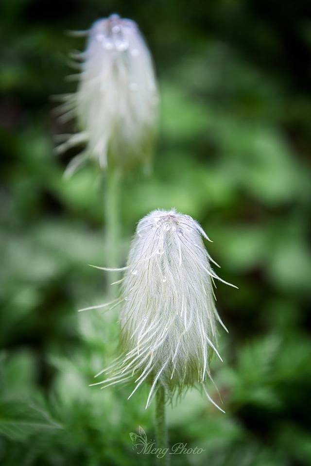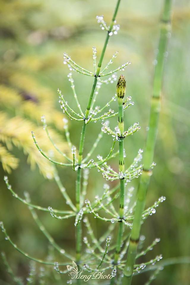 刚刚看到的瀑布汇成小溪流入绿宝石湖,走过木桥看到路边的植物身上沾满水珠,非常特别。