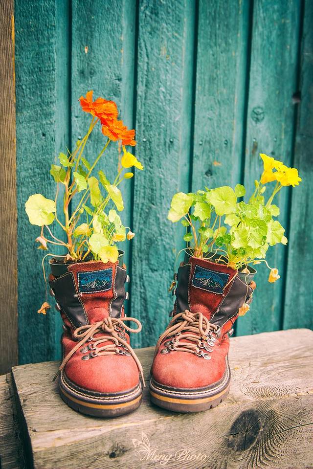 在停车场停好车以后,我花了好一阵才找到入口,因为晨雾实在太大。还一度走进了坐落在湖边的木屋式酒店,和两位早起跑步的酒店客人聊了会儿天。绕了一圈才发现虽然小径是相对环形的,但两个入口的位置并不在一起。最后是在租独木舟的小店边上才发现了入口。小店的座椅上放了一个特别有意思的摆设。拿靴子当花盆是真得没见过,给店主的创意点个赞。