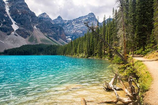 曾经被印在20加元背后的梦莲湖坐落在离路易斯湖约15公里的地方,虽然听上去距离很近,但通向梦莲湖的道路是山路,转弯很多,开车过去起码要1个小时。这条山路冬天会被积雪封住,只有6月初到9月底雪完全融化时才会开放。
