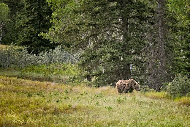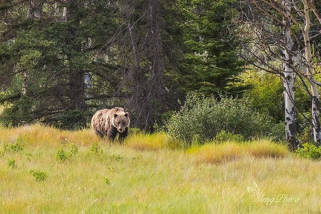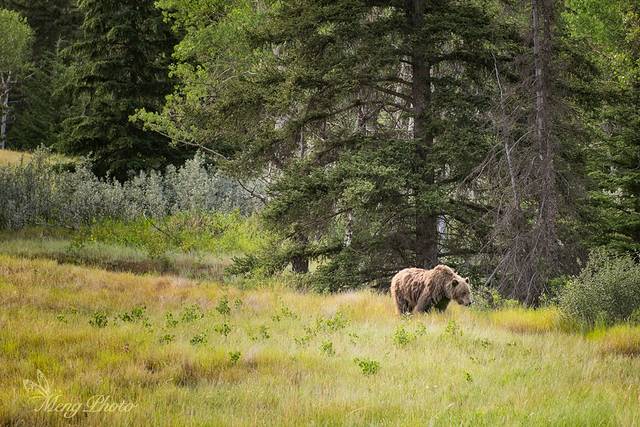 而就在我爸感叹,这次看到不少动物,就是没有看到熊,有点遗憾的时候。前方出现了大量的车辆停在路边。已经不用考虑其它的可能性,我直接把相机掏出来冲下车。果然是一只大家伙,传说中的Grizzly Bear棕熊啊!