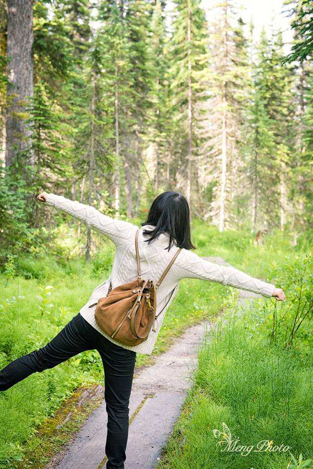 小径的前半段路非常平坦好走,连轮椅都可以推着进去。但过了木桥的后半段就相对比较泥泞了。一直都在树林间行走,偶尔才都能够看到右手边的湖。拍不了湖,就只能拍自己了。把相机给我爸后,元气背包少女滑稽出镜