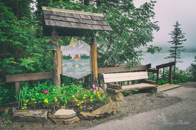 沿着小径越走越深,包围着绿宝石湖的群山也展露出它们的风彩。峭壁,瀑布,一个个都能看得清清楚楚了。真想就安静地坐在木椅上,看着平静的湖面动也不动。