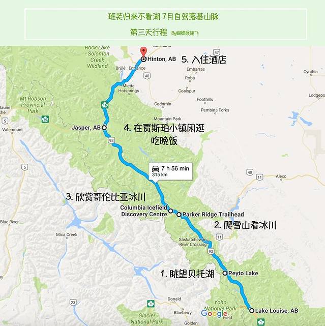 今天的行程非常艰巨,要从班芙国家公园开到贾斯珀国家公园,之后再开到国家公园外的小镇入住。连接班芙和贾斯珀的冰原大道是全世界最美丽的公路之一。一路上雪山延绵,湖泊河流众多,还有壮观的大型冰川。想要一天开完整条大道,光是花在路上的时间都有5个多小时。