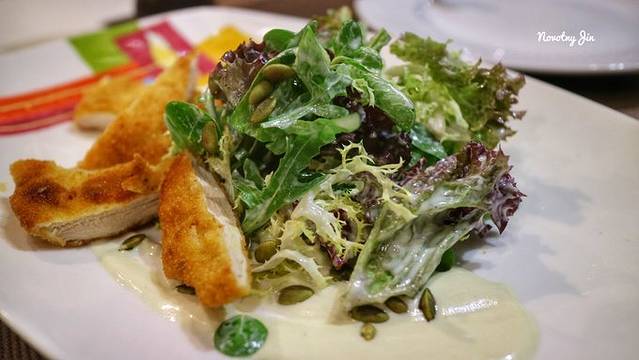 炸鸡排配沙拉。要知道全世界做炸物最有研究最优秀的地方就是日本~这鸡排做的和日本炸鸡排的技术已经不相上下了!