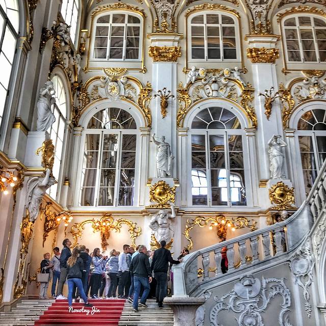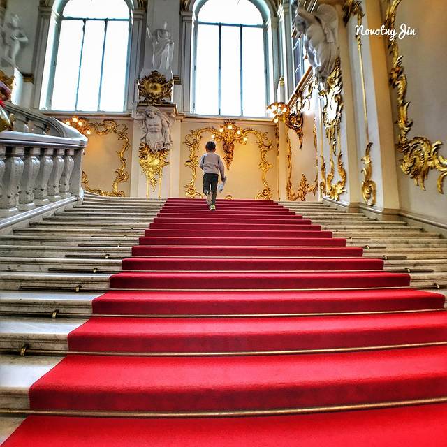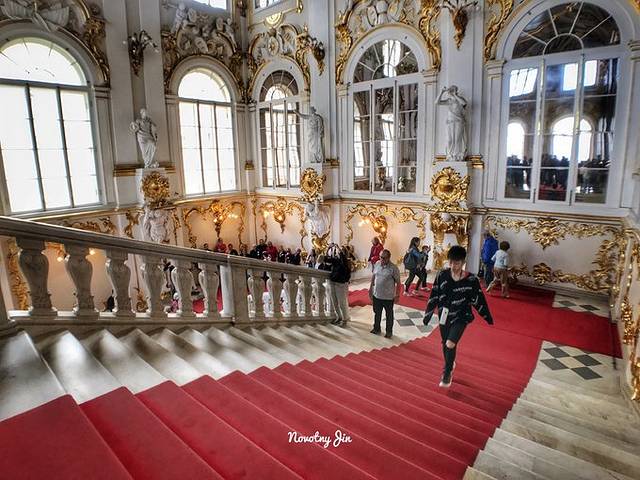 「 埃尔米塔日博物馆 」其实是租用了冬宫的一部分作为展厅。冬宫曾经是俄罗斯沙皇的宫殿,现在是世界四大博物馆之一(另外三个分别是纽约的大都会博物馆,伦敦的大英博物馆和巴黎的卢浮宫)。博物馆拥有300万件藏品,多亏了艺术爱好者叶卡捷琳娜女帝,藏品从她的时代开始不断丰富。据说如果每个藏品停留5秒时间,那么需要用3年的时间才能看完整座博物馆...(作为一个艺术界的小白,考古界的小白鼠,我还是主要欣赏一下美丽的建筑吧...)