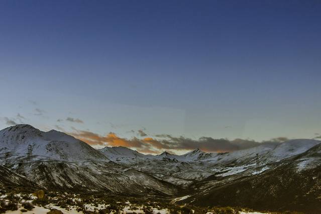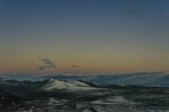 一夜后夜色正浓客车便出发了,在天刚蒙蒙亮时车窗外的雪山云海浮现眼前,景色很是壮观。