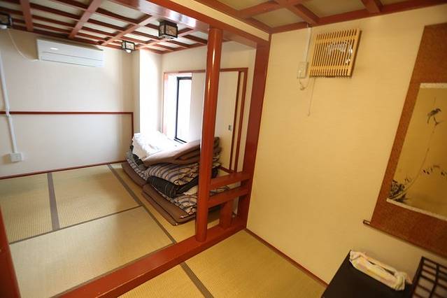 放几张照片,榻榻米卧室柱子里面睡2个人,外面睡1个人(自己叠的被子有点乱),右边有个小桌子。
