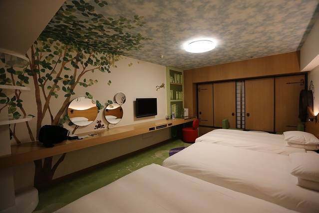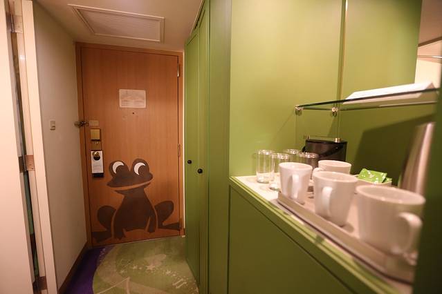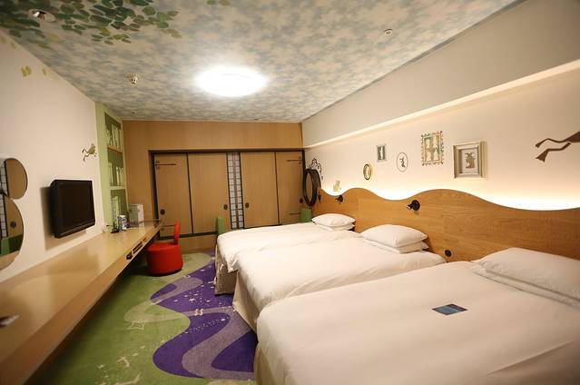 我们入住的这件是青蛙主题的。房间里有mini bar,还有2本绘本。三人间的床是可以移动的,拼起来就是好大一张。
