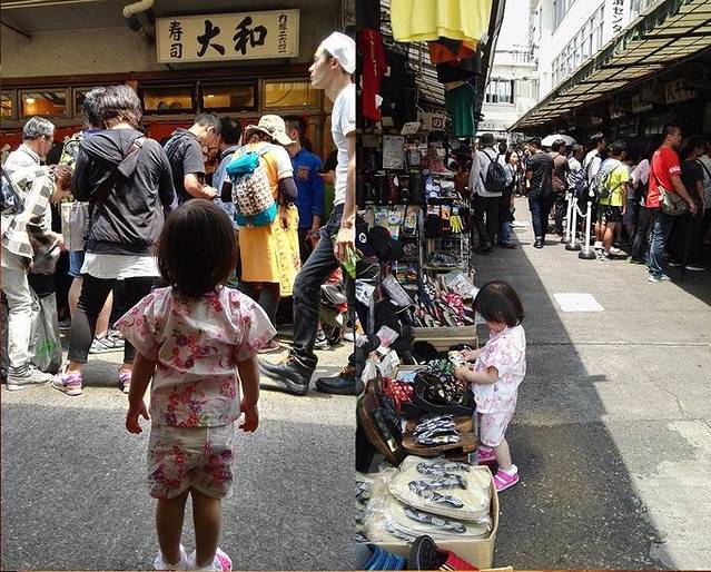 10:00-12:30 兵分两路,留一人排队大和寿司(主要是优爸),剩下轮流在周边溜达,在此期间优酱吃了2块大定玉子烧,在袜子摊”帮忙理货“,倒也没嫌烦。