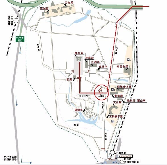 13:00-13:30 前往明治神宫地铁大江户线(E18筑地市场-E26代代木),步行1km。