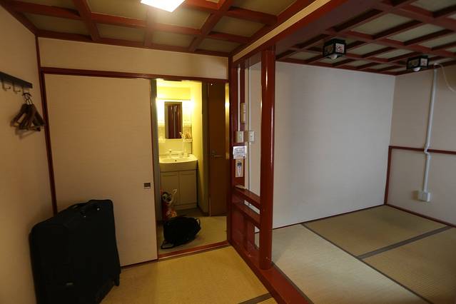三人间房间很小,包含一个迷你过道、一间榻榻米卧室、一个独立淋浴间、一个独立卫生间、洗漱的地方也是分开的,只是每个部分都很小。过道放2个大号箱子就过不去人了,所以只放了1个箱子,另1个拿到了屋里去。