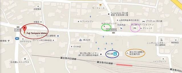 红色:いだ天(天妇罗餐厅)、绿色:不动乌冬面、粉色:河口湖站旅馆、蓝色:河口湖站、橘色:河口湖旅游咨询中心