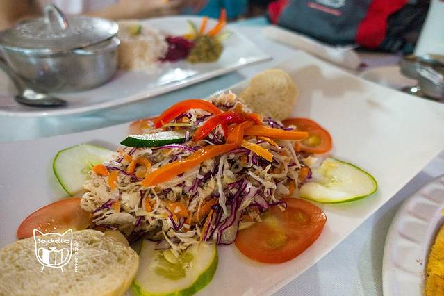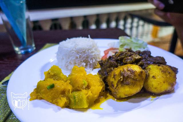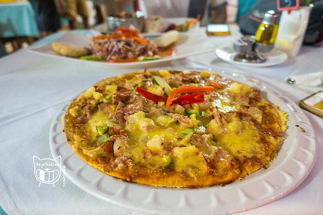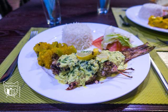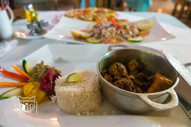 留尼旺海湾就在码头再往南,靠近小教堂的地方,海边绝佳的落日观赏点有一整排的餐厅和酒吧,刚从水里爬起来风干的我俩赶紧穿上衣服裤子,在Chez Marston占个好位置,来上一桌克里奥尔菜,再加上披萨和看不懂菜单也看不出原料的沙拉……