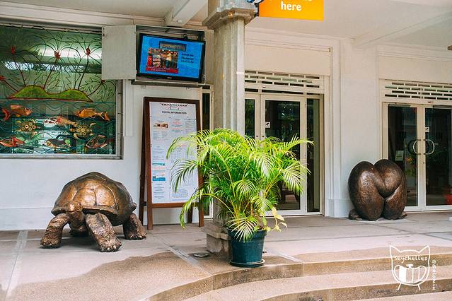 门口有象龟和海椰子的房子,是邮局,出售各式明信片、纪念邮票。