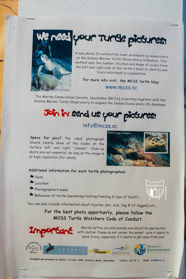 留尼旺的一些研究人员发起了一项对印度洋海龟种类的调查,塞舌尔当地也有机构加入这项活动。希望游客和潜水爱好者们能够将自己在海里拍到的海龟照片发给他们,并注明时间、拍摄地点、海龟的动作及拍摄者名字。