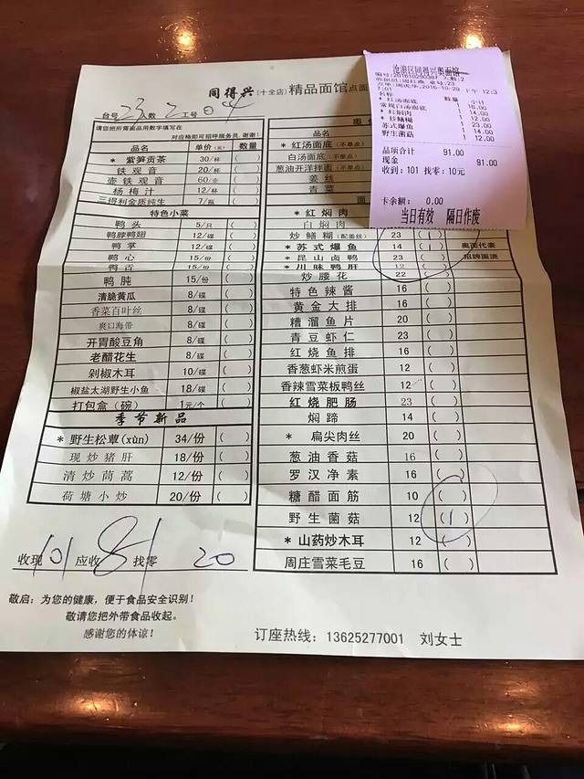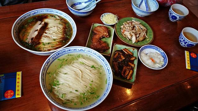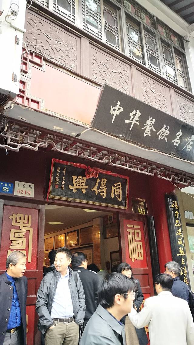 第五站:同得兴十全街店。这家原本是此行的重头戏。同得兴因为上过舌尖2,因此名声大作。12点到的,已经有很多人在等位了,拿了号,等了15分钟后就轮到我们。上楼,将已在楼下点好的面条单子交给服务员,服务员一看我们四人只点2碗面,说:我们店严禁吃外食。因为时令限制,同得兴最有名的白汤枫镇大肉面10月中旬就没有了,所以我们没有尝到。同得兴的面价格小贵,光面16元,但不能单点,浇头基本都是10元以上,我们点了红汤(16元)白汤(14元)面各一份,浇头点了红焖肉(12元)、爆鱼(14元)、鳝糊(23元)和野生菌菇(12元),结账91元。从汤底上来说,白汤胜于红汤,我尝出了猪油的香味;从面条上来讲,偏软,由于我喜欢偏硬的面条,所以不是很喜欢同得兴的面条;从浇头上讲,红焖肉号称得过金奖,肥瘦相间,比例恰好,可是我个人觉得偏咸,爆鱼味道不错,但大部分苏式爆鱼味道都差不多,14元的单价让它性价比狂跌,鳝糊,价格小贵,量奇少,但味道很不错,鳝鱼蛮大片的,没有腥味,这个倒是我们一致认为最好吃的浇头,菌菇没啥大特色,就是些常见菌菇。总而言之,同得兴性价比很低,难得尝试一次即可,应该不会再去第二次,面的总体水平我们一致觉得还是早上的荣阳楼高,包括老同学也说同得兴性价比很低。