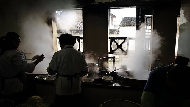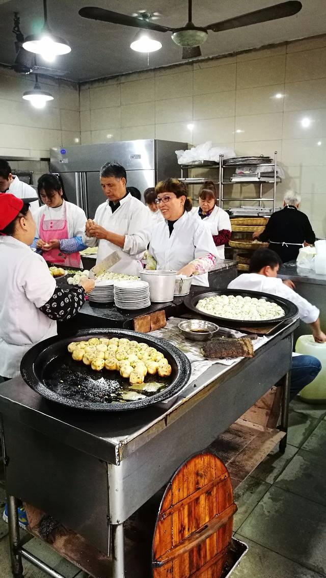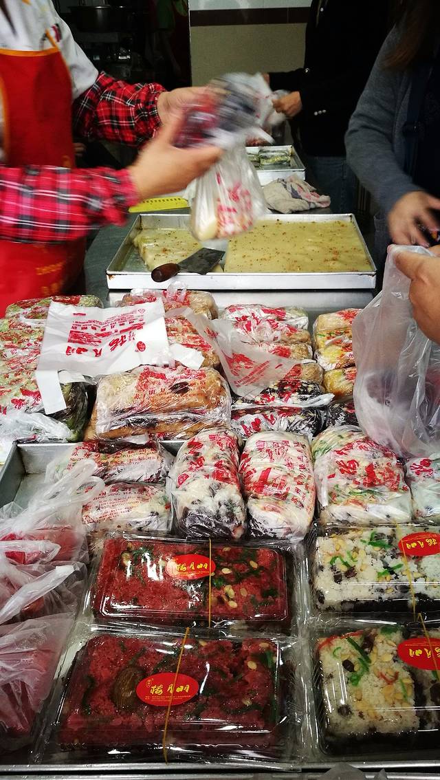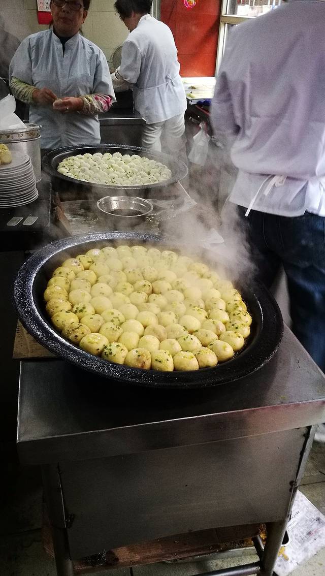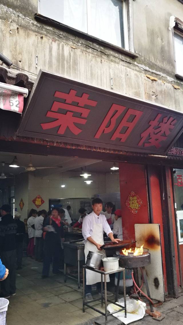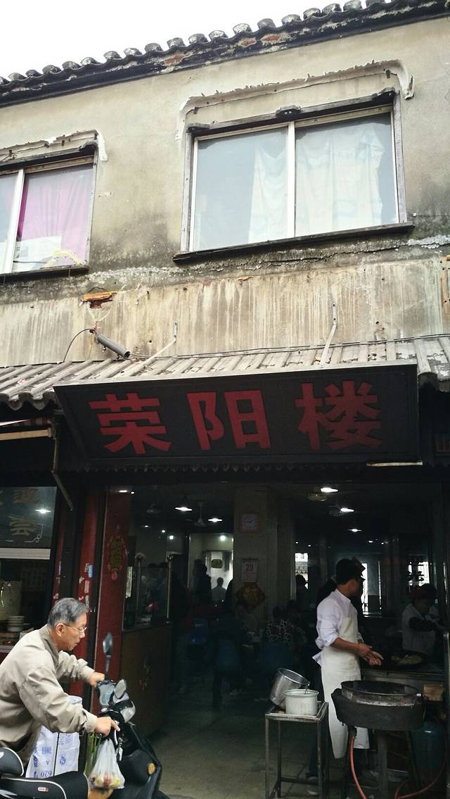 我们的第一站是位于山塘街的荣阳楼。荣阳楼这一段的山塘街更加贴近生活,满满的苏州早晨的味道,两边不时传来叫卖声。沿途经过了“万福兴”糕团店,因为发现糕团不多了,所以没下手。继续走了一小段路,就能发现荣阳楼。荣阳楼和想象的不太一样,一般我都会认为有个“楼”字的至少应该装修的飞檐朗阁,带点苏式园林的古意。但是现实的荣阳楼却是完全不一样,甚至可以说有点残破不堪。如果不是大门上还挂着“荣阳楼”三个大字的牌匾,我想我估计也只会对他一扫而过,把它当作一个普通菜场小饭店。荣阳楼虽然破旧,但生意出奇的好,从我们进店到出店,店里始终坐的满满当当,都是附近的居民来吃早餐。