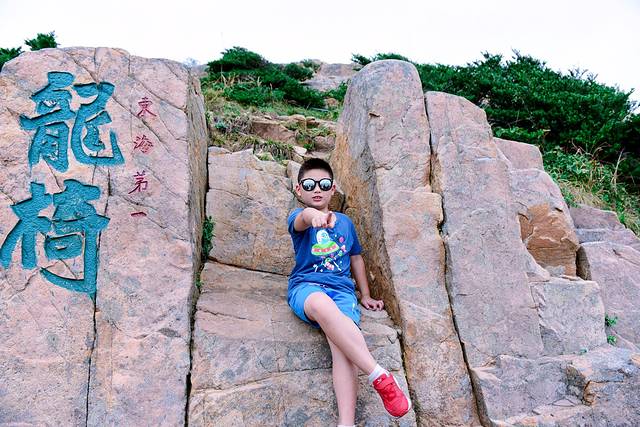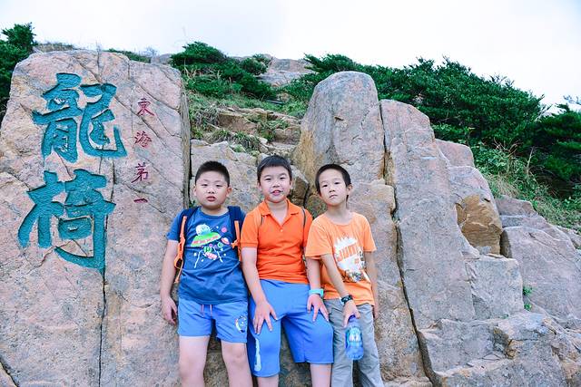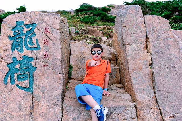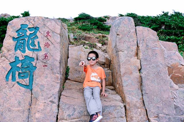 继续往前走,远远看到白色灯塔,又是一番拍摄。突然,娃儿们兴奋起来,原来看到一石椅,乃是由石头拼接,一石上赫然写着“龙椅”二字。三娃争先恐后地抢着坐轮椅,纷纷摆出自认最为霸气的姿势。由于在龙椅处花费较多时间,走到灯塔处就作罢,不再继续往前。回程偶遇一山洞,两娃爸拿着手机往里探了探,无果。等到司机来接时,天已大黑。回到民宿,一番简单梳洗后吃了晚餐。