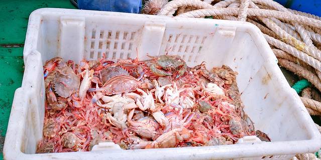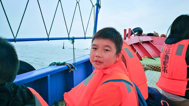一上船就感觉不对了,没开多久一半大人们都晕的七荤八素了,甚至直接躺倒。三个娃胆子倒挺大,一个个站着靠着围栏,用岸上买的渔网,想从海里撩点啥。这时,船老大把船停在大海中央,放网。这时就是枯燥的等待,加上浪起船涌,一股股眩晕愈发厉害。好不容易,船老大有收网迹象,人总算兴奋了一下。只见船老大拉起一网,略显沉重,心里暗喜,看来收获不小,一倒,哇塞,看来收获颇丰。一眼望去,全是螃蟹和小虾,足足装了5桶(桶船上都备着,10元/个)。然后打道回府,海钓也就结束了。说是海钓,可是连网都没摸着,就是坐着船出海,看着船老大撒网,看着船老大拉网,看着他把打上来的东西装到桶里,最后再由我们提着拿回去。遗憾的是,我们这一网,一条鱼都没有网到。