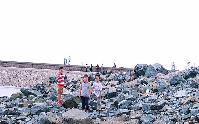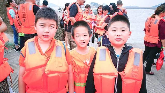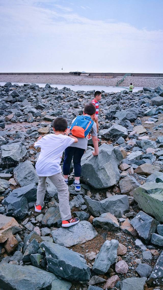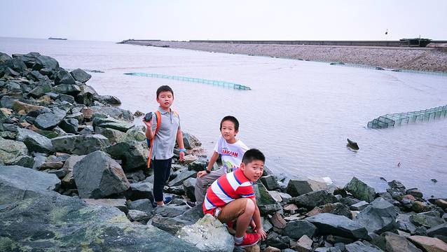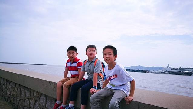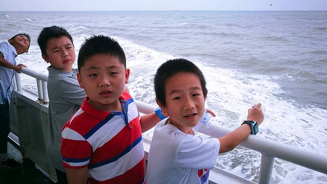 10.1一大早,凡童鞋就催着出门,同时也怕堵路上,12:30的船,8:30就出门了,一路畅通从S20到S2,再过东海大桥,9:40到达沈家湾码头。车子停码头边上的停车场,48元上限/每天。由于订的套餐儿童票要自己买(让我们直接上船补票),为了安全起见,先去售票大厅询问了一下,答复的确是直接上船买,总算放下心。10:30左右,三兄弟高兴地成功汇合,然后去码头边上的石滩探险去了。黄拉拉的海水,配合着蓝天白云,虽说观赏度不佳,但好歹比城市的钢筋水泥来的让人心旷神怡些。