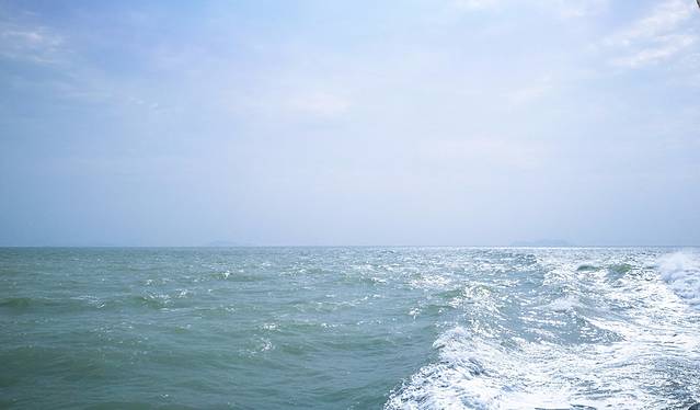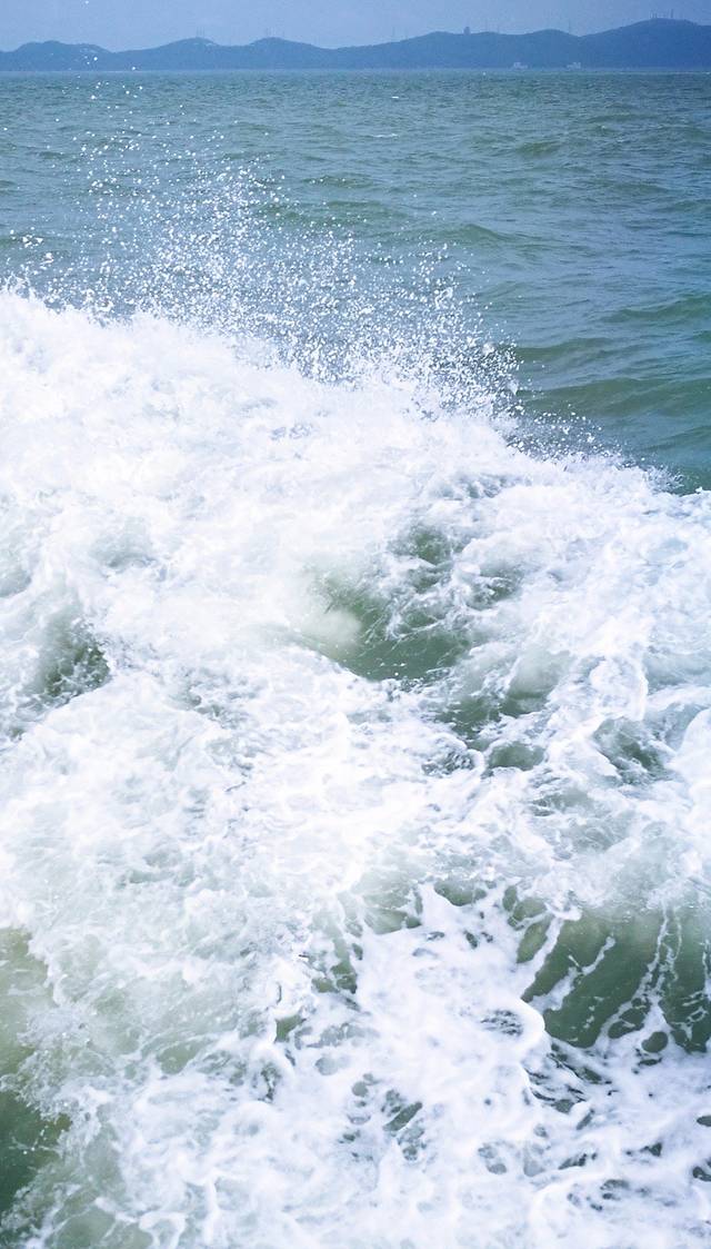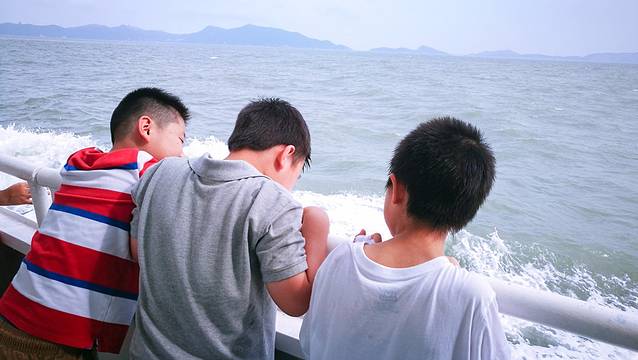 三娃待船一启动就按耐不住,全跑到甲板上呆着了。由于风浪,船晃的挺厉害,走路跌跌撞撞的。三娃跑到最前方的甲板上,看着浪花一个个扑打上来,显得超级兴奋,尤其到了后面,一个浪花猛的一扑,小轩童鞋一个闪躲不及,全身湿透,另外两个娃顿时“哈哈大笑”。渐渐的,海水变得绿起来,清澈起来,在太阳的照射下,像一块碧玉闪着迷人的光泽。